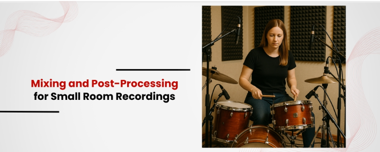 Small room recordings often need corrective EQ to tame boxy midrange frequencies (around 200–500Hz). Gentle compression can control peaks without making drums sound squashed.