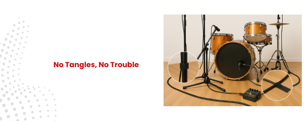 Messy cables can make people trip, unplug mics, or cause noise. Run them behind stands and fix them with tape or Velcro ties. Keep pedal cables away from where people walk.